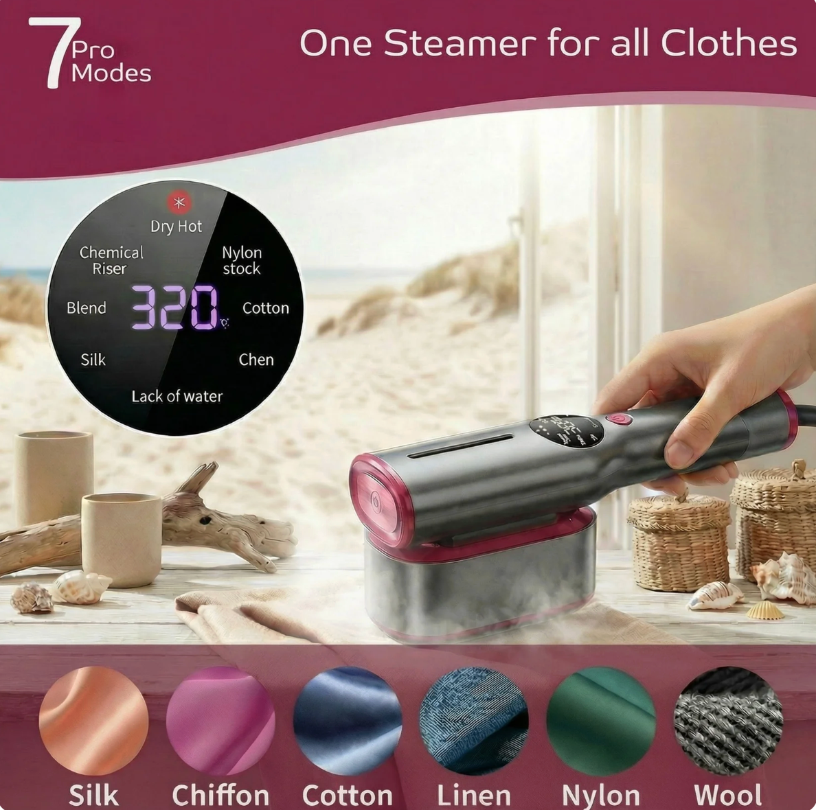 - Fast-heat &7 Modes Choose:15s quickly heat,The handheld steamer for clothes has 7 ironing modes to choose from,such as dry ironing, tweed, cotton, linen, silk, blends, synthetic fibers,excellent heating speed and excellent wrinkle removal ability make it ideal for fast and efficient garment care
