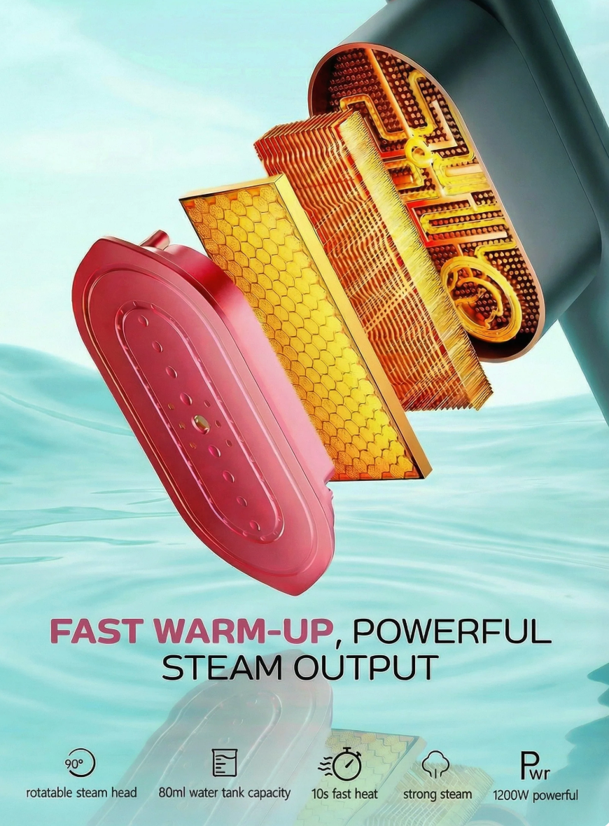 - Efficient Wrinkle Removal & Rotatable Head Design:Combining powerful steam iron for clothes injection with dry ironing,the portable steamer for clothes not only deeply penetrates fabrics to quickly remove wrinkles but also the rotating head design allows for use at any angle, meeting diverse ironing needs